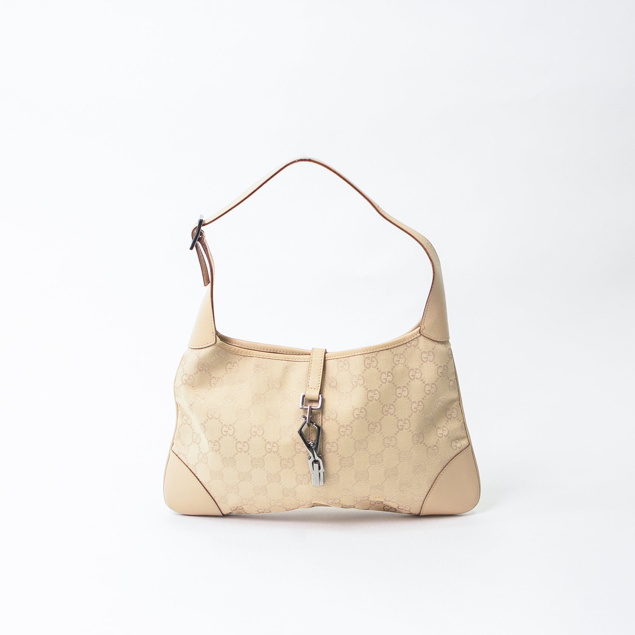 This Gucci Jackie Shoulder Bag in beige GG canvas is in good pre-loved condition with signs of regular use.