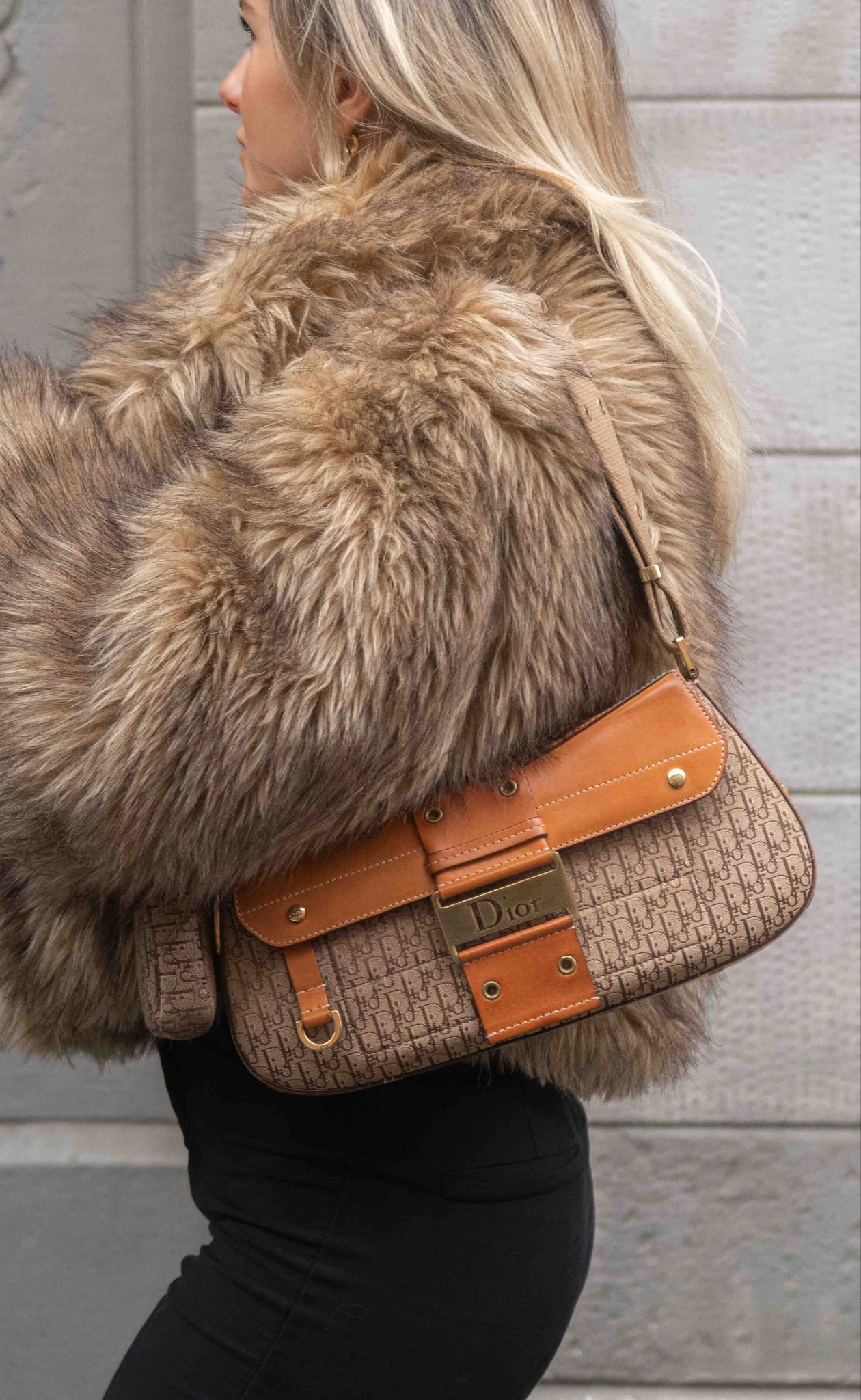 Vintage Dior Columbus bag crafted in Dior monogram canvas with warm brown leather details and antique gold-tone hardware. Classic shoulder bag silhouette featuring the iconic Dior logo plaque at front and a detachable mini pouch for added functionality. A refined everyday piece with timeless Dior character.